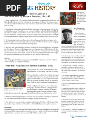 Romare Bearden Folk Musicians - Black Artists Throught History Part 2 Romare Bearden Collage Art Media : Three musicians, one with a guitar in hand, dominate this scene painted in rich browns and blues;